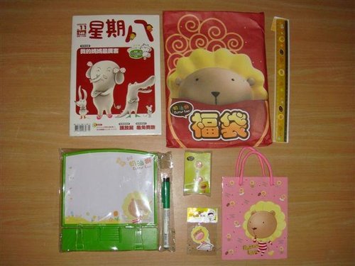 他是3樣禮物選一,驚喜袋、購物袋、色筆,另外再贈送一本"星期八"雜誌